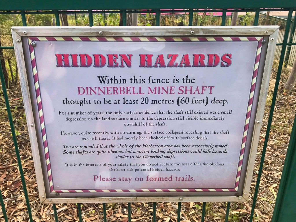 In the middle of the carpark was a fenced off area with a warning: Hidden Hazards! Within this fence is the Dinnerbell Mine Shaft, thought to be at least 20 metres deep. It did not look like much from the top, but I bet it is a long hard fall, if you were to fall down there.